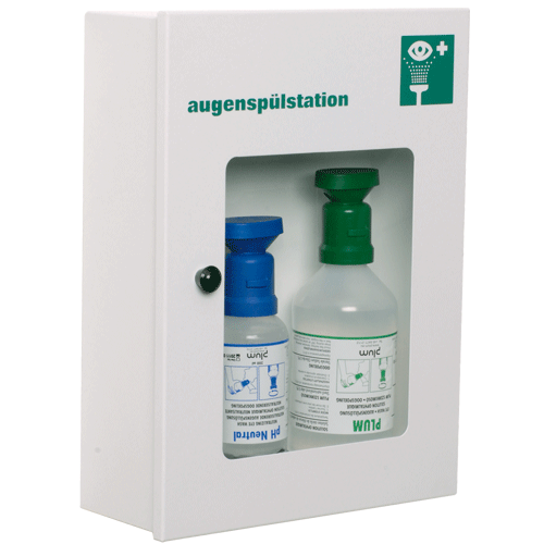 - Silmä-ensiapuasema pölytiiviissä seinäkaapissa ikkunan kanssa, materiaali teräspelti, valkoinen pulverimaalattu