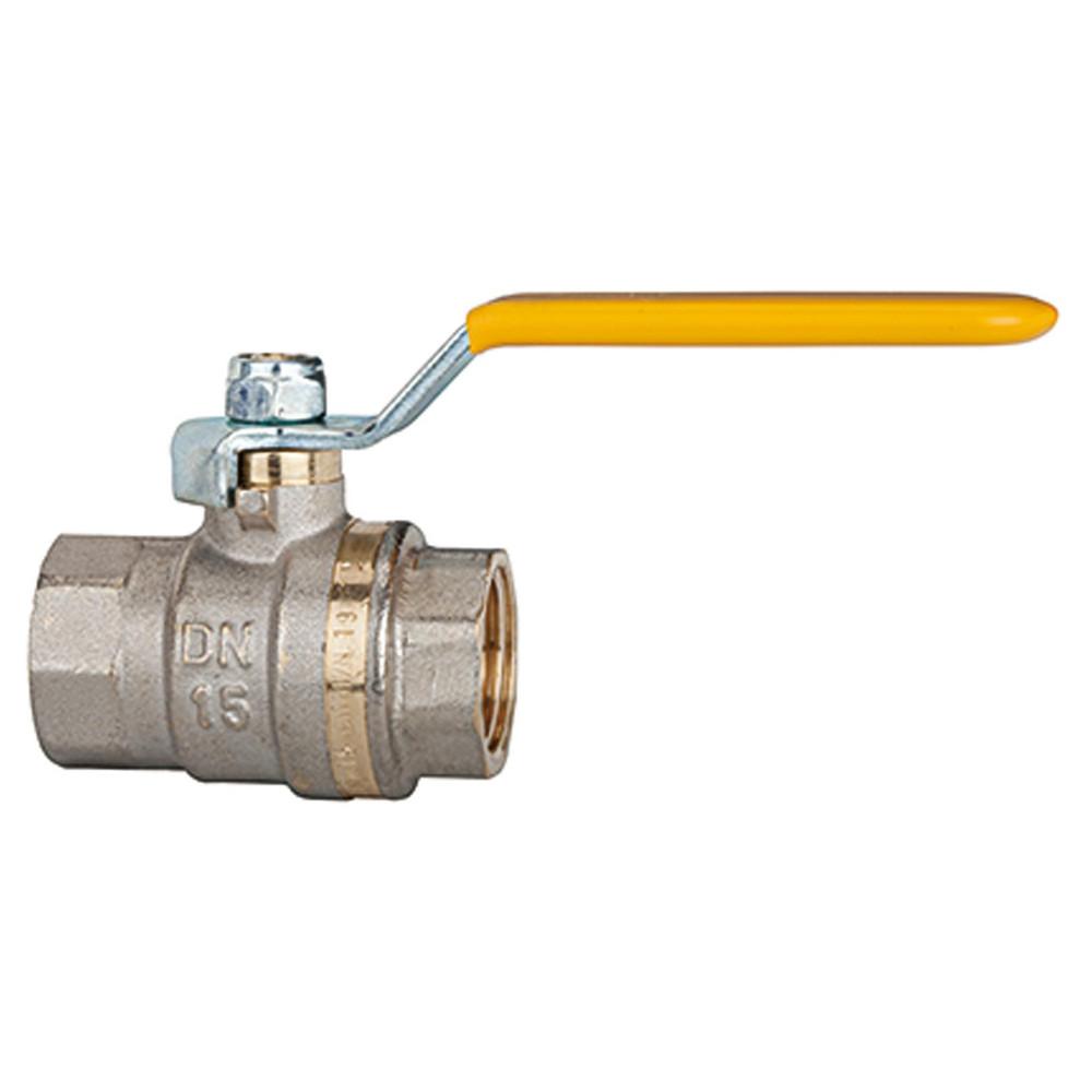 - Vakiomallin kuulaventtiili keltaisella teräsvivulla on kestävä 2-tie sulkuventtiili, joka on valmistettu nikkelöidystä messingistä ja jossa on sisäkierre/sisäkierre.