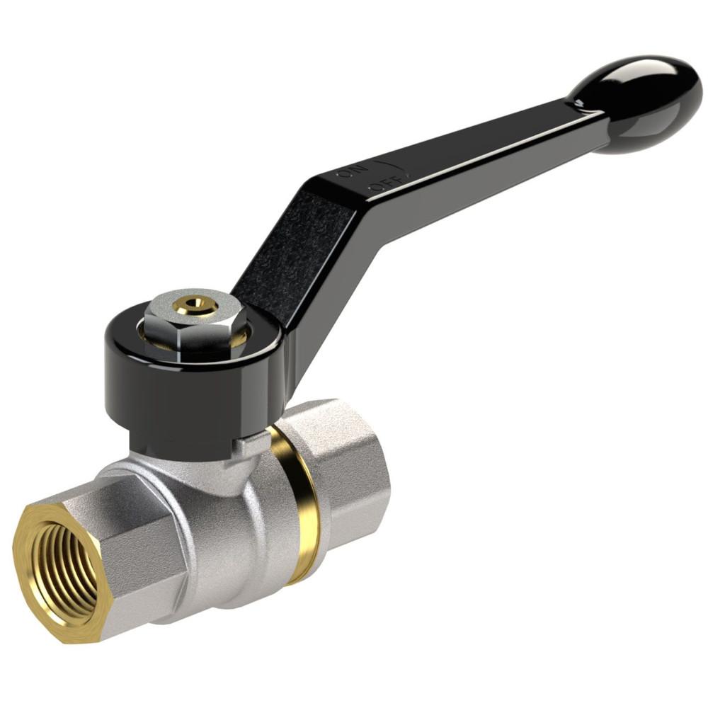 - Vakiokokoinen täysaukkoinen palloventtiili on kestävä 2-tie sulkuventtiili, joka on valmistettu nikkelöidystä messingistä ja jossa on sisäkierre/sisäkierre.